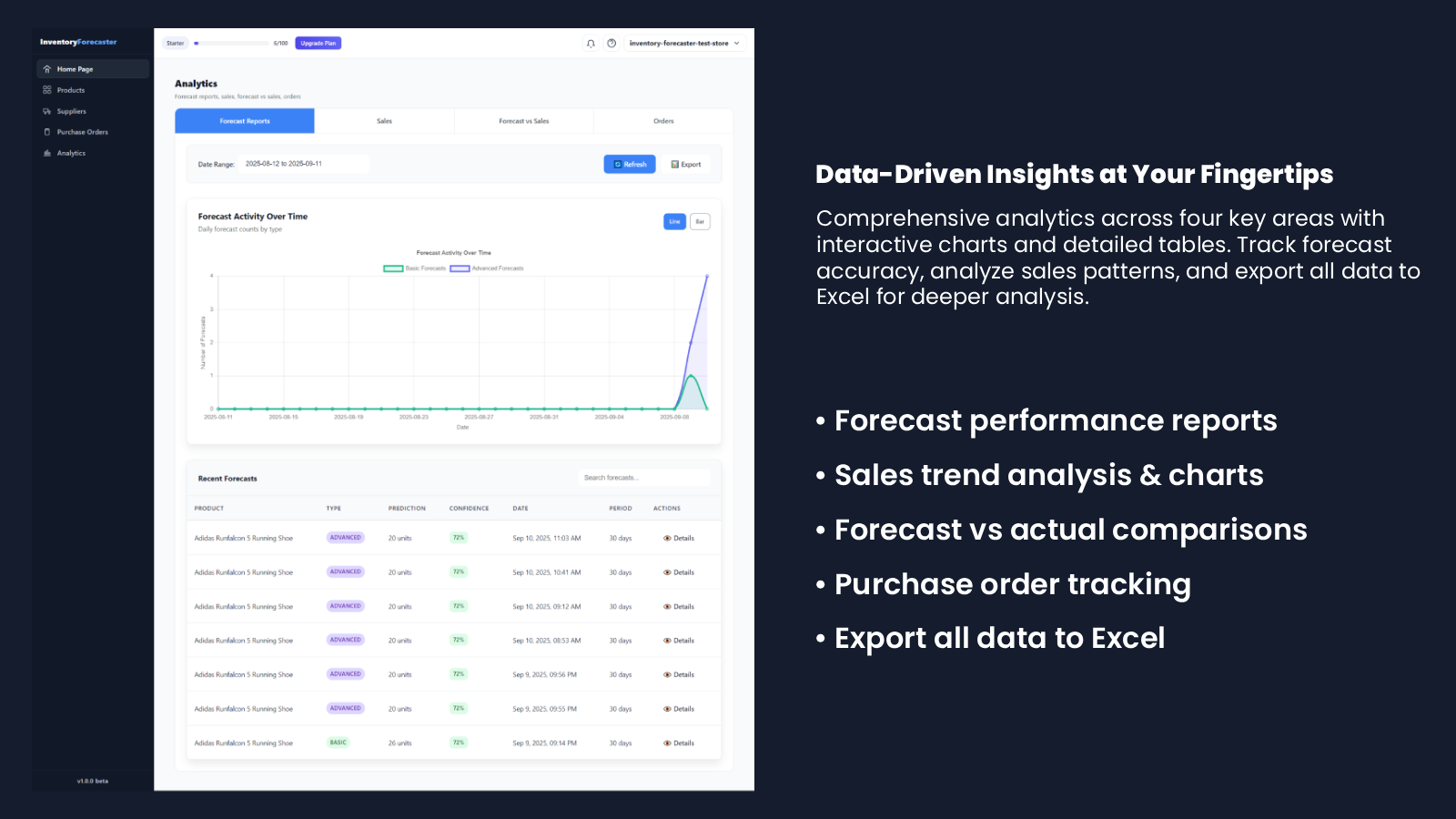 Sit back and watch as the app automatically generates forecasts, creates purchase orders, and keeps your inventory optimized 24/7.